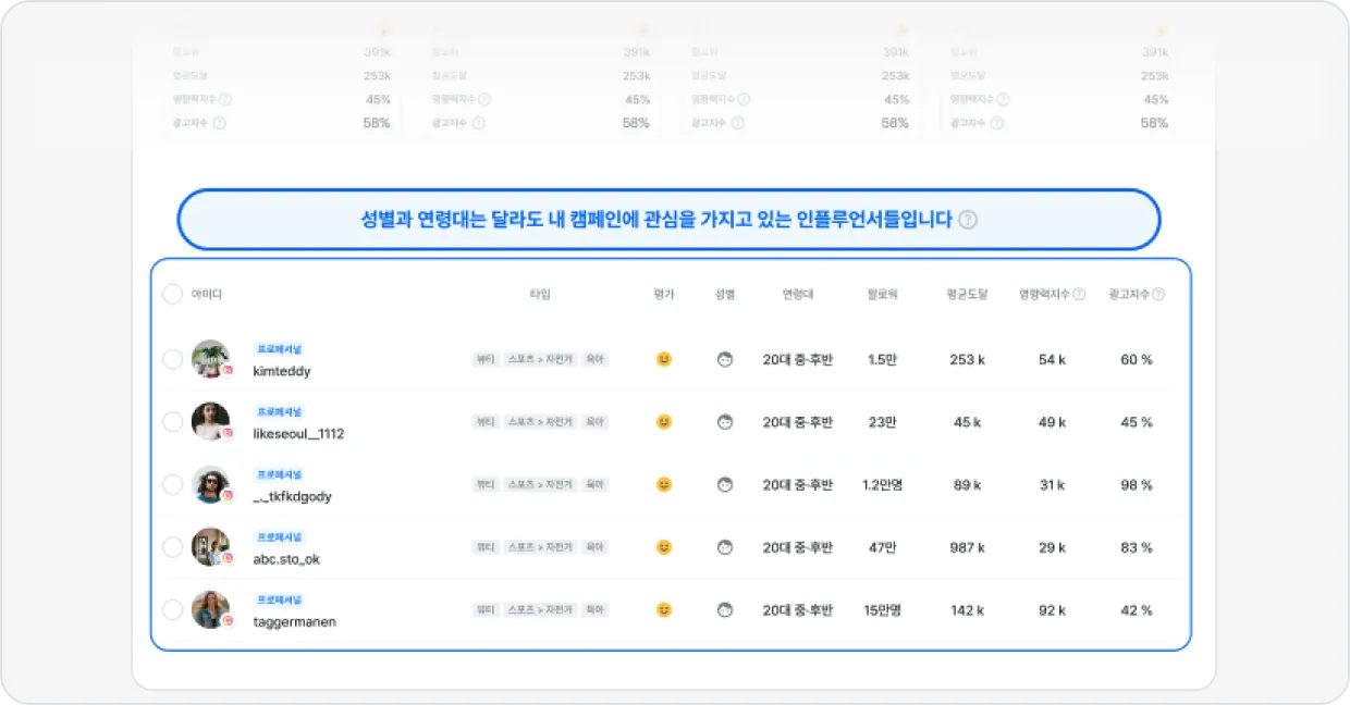 기존에 설정한 성별과 연령대가 아니더라도 캠페인에 신청한 인플루언서 중 적합한 인플루언서를 찾을 수 있어요.