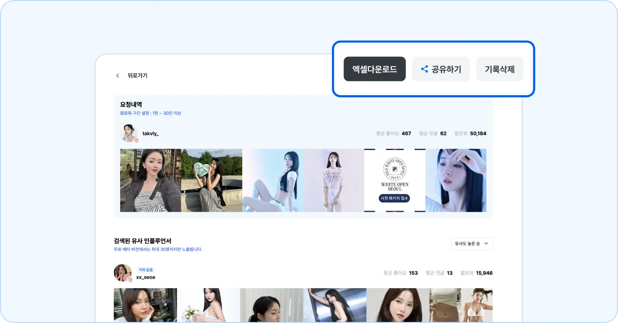 유사 인플루언서 찾기, 포스팅 성과, 상위 노출 블로그 검색 결과를 공유할 수 있어요.