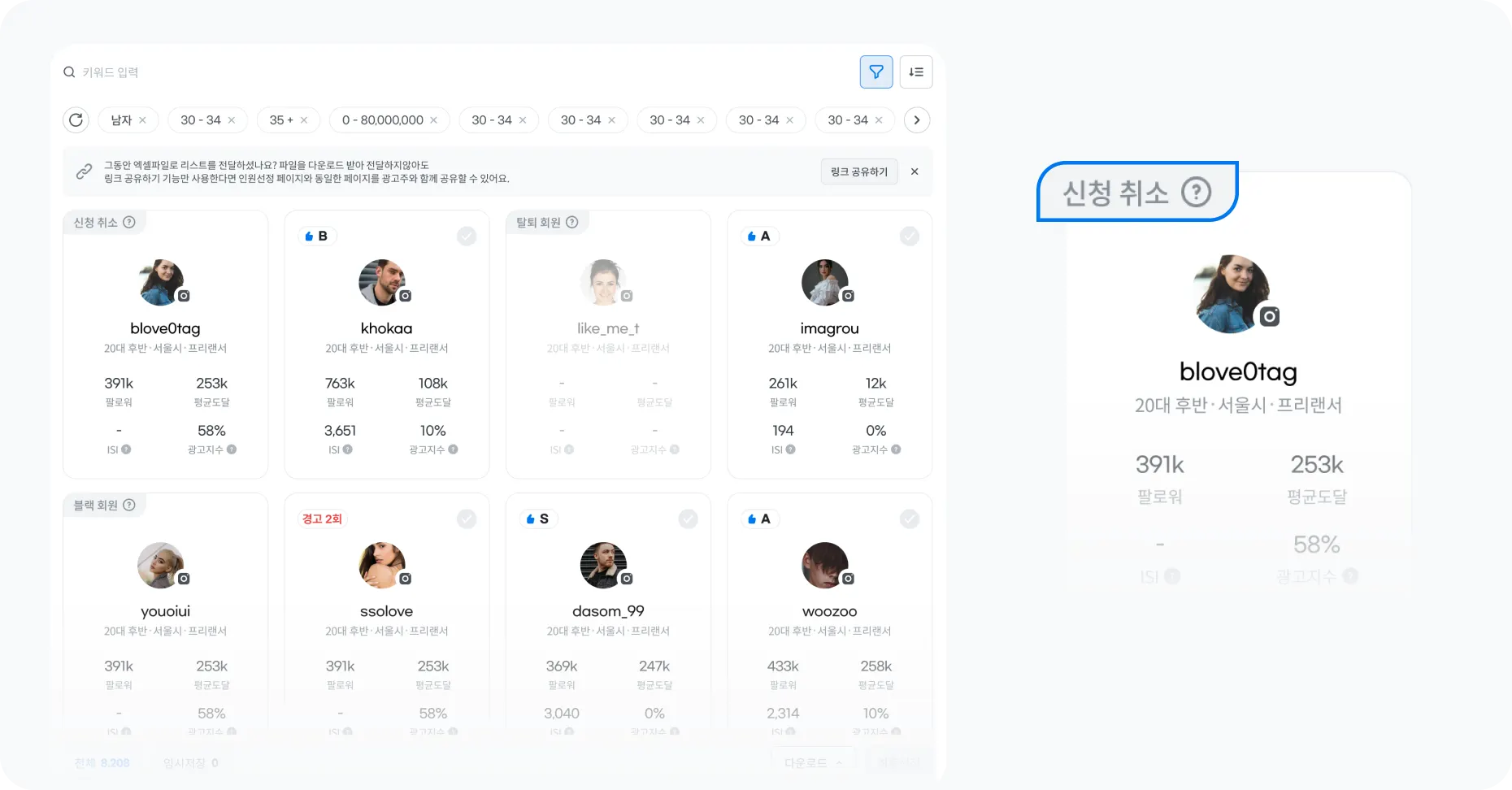 “신청 취소, 탈퇴 회원, 블랙리스트 회원, 경고 횟수” 등 캠페인 선정 시 필요한 인플루언서들의 계정 상태 정보를 추가했어요.