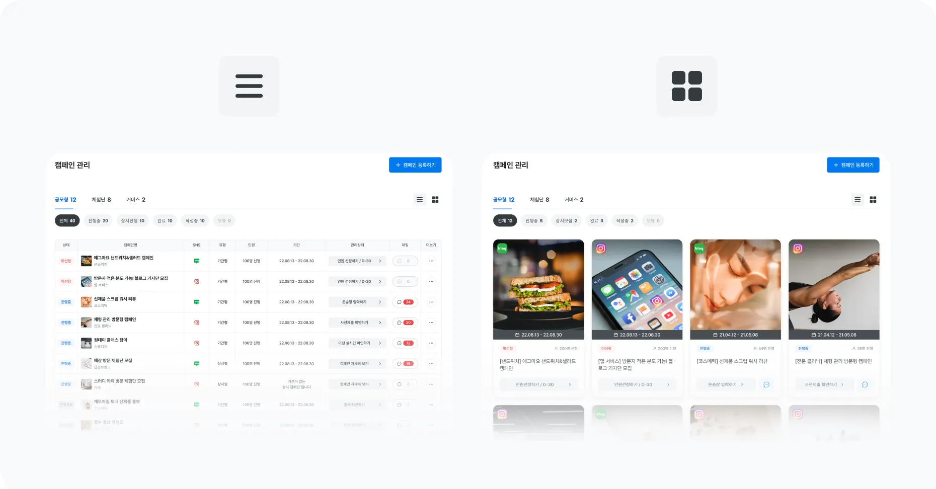 기존 카드뷰는 좀 더 가독성 좋게 개선되었고, 캠페인을 한눈에 관리하기 좋은 리스트 뷰도 추가되었어요. 캠페인 상태별로 해야할 미션들을 놓치지 않도록 장치도 마련했어요.