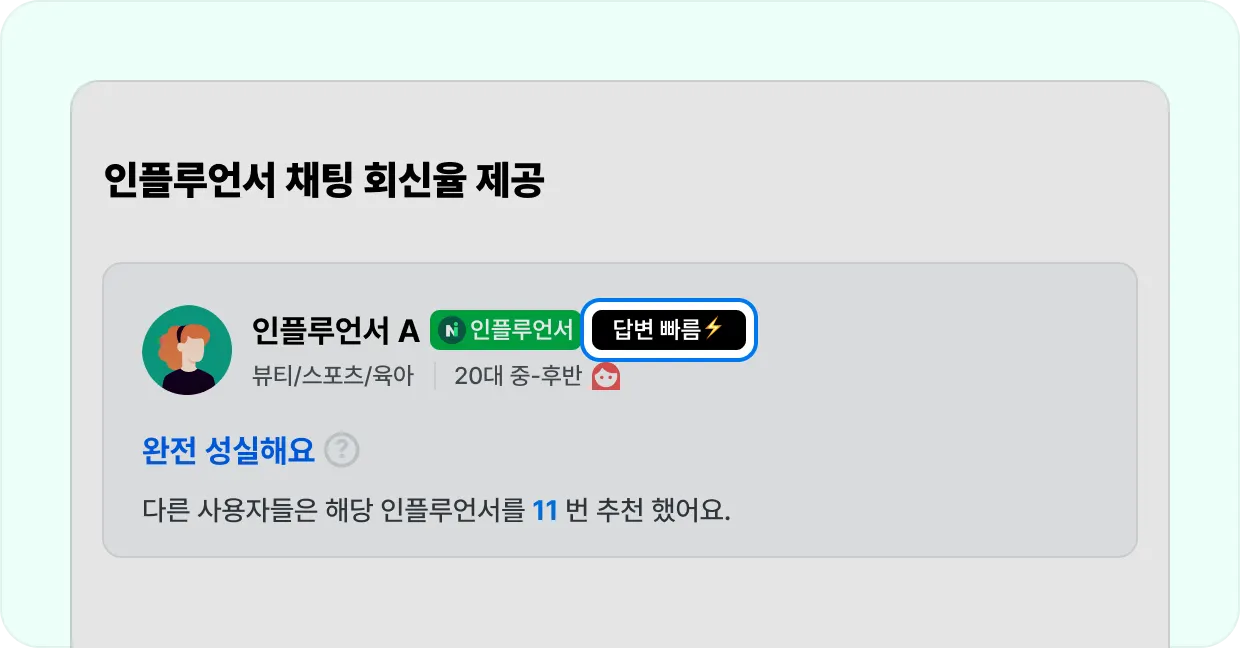 이제 인플루언서를 선정하기 전에 평균 회신 속도를 확인할 수 있어요. 회신 속도가 빠른 인플루언서는 성실도와 적극성도 높아요. 쾌적한 캠페인 운영에 도움이 되실거에요.