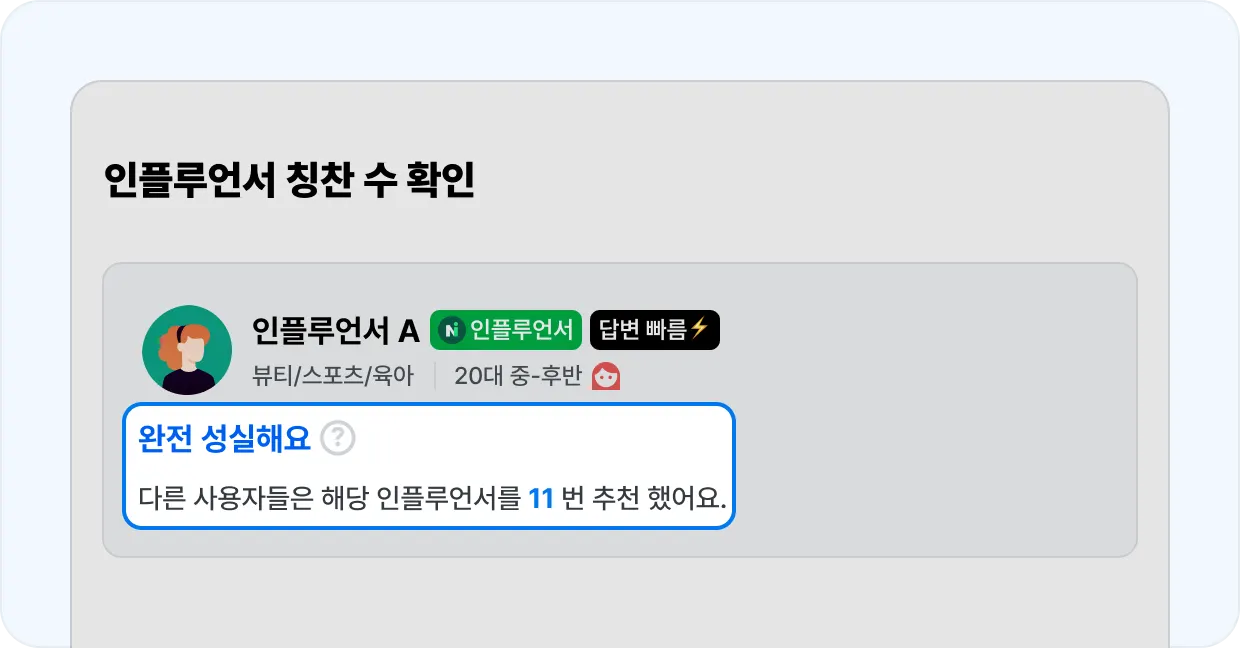 광고주님이 인플루언서와 진행하면서 받은 칭찬 후기를 이제는 숫자로 확인할 수 있어요.