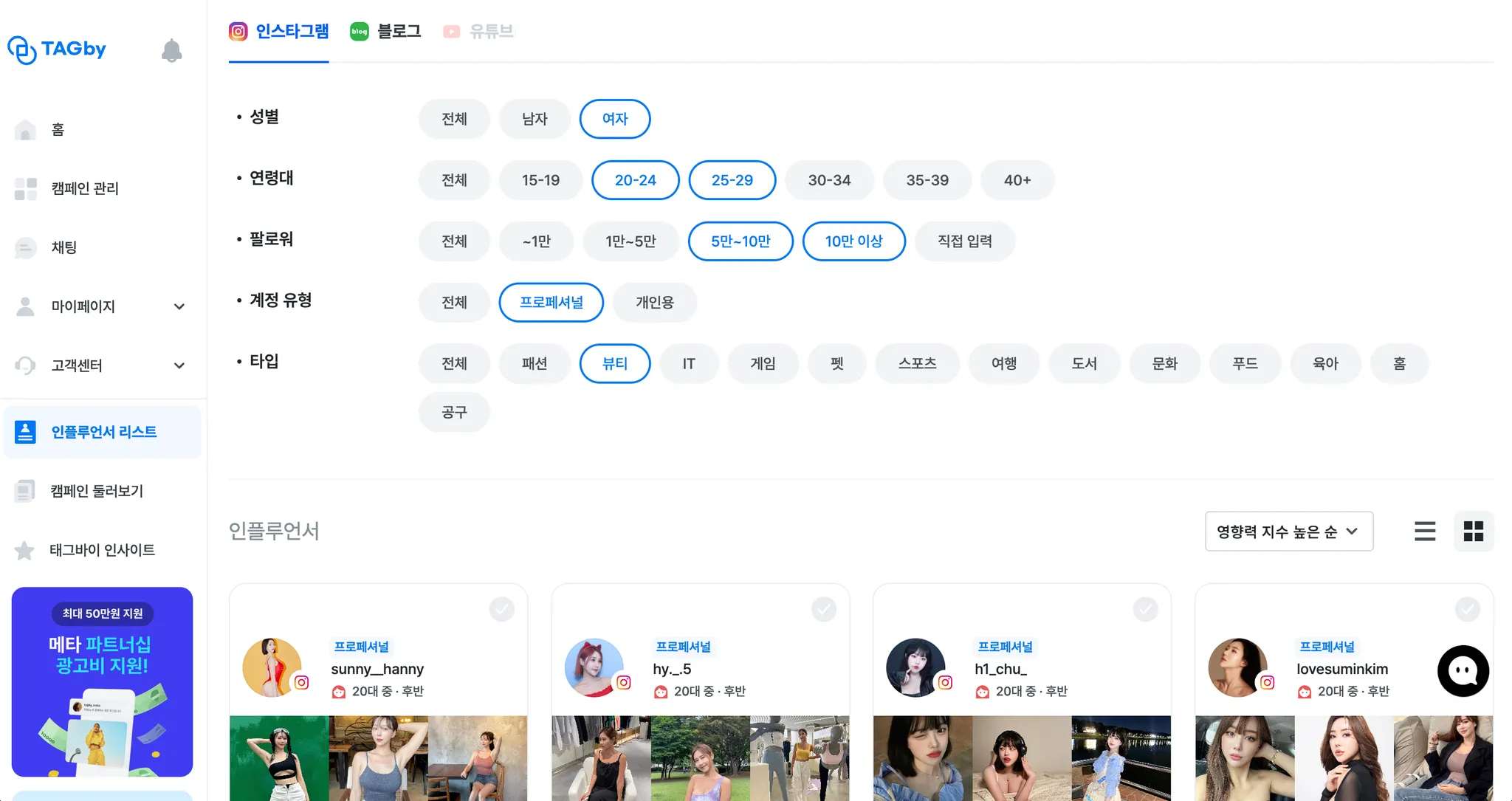 그중 콘텐츠 마케팅 SaaS 분야에 있는 태그바이는 인플루언서 마케팅을 누구든지 쉽게 사용할 수 있도록 해주는 서비스를 제공한다. 태그바이를 이용하면 서비스 구독료만으로 가입된 3만명의 인플루언서를 활용해 다양한 인플루언서 마케팅을 무제한 진행할 수 있게 된다. 또한 기존에는 활용할 수 없던 고품질의 인플루언서 데이터를 수집하고 분석해 기업의 제품에 최적의 인플루언서를 찾을 수 있도록 해준다.
