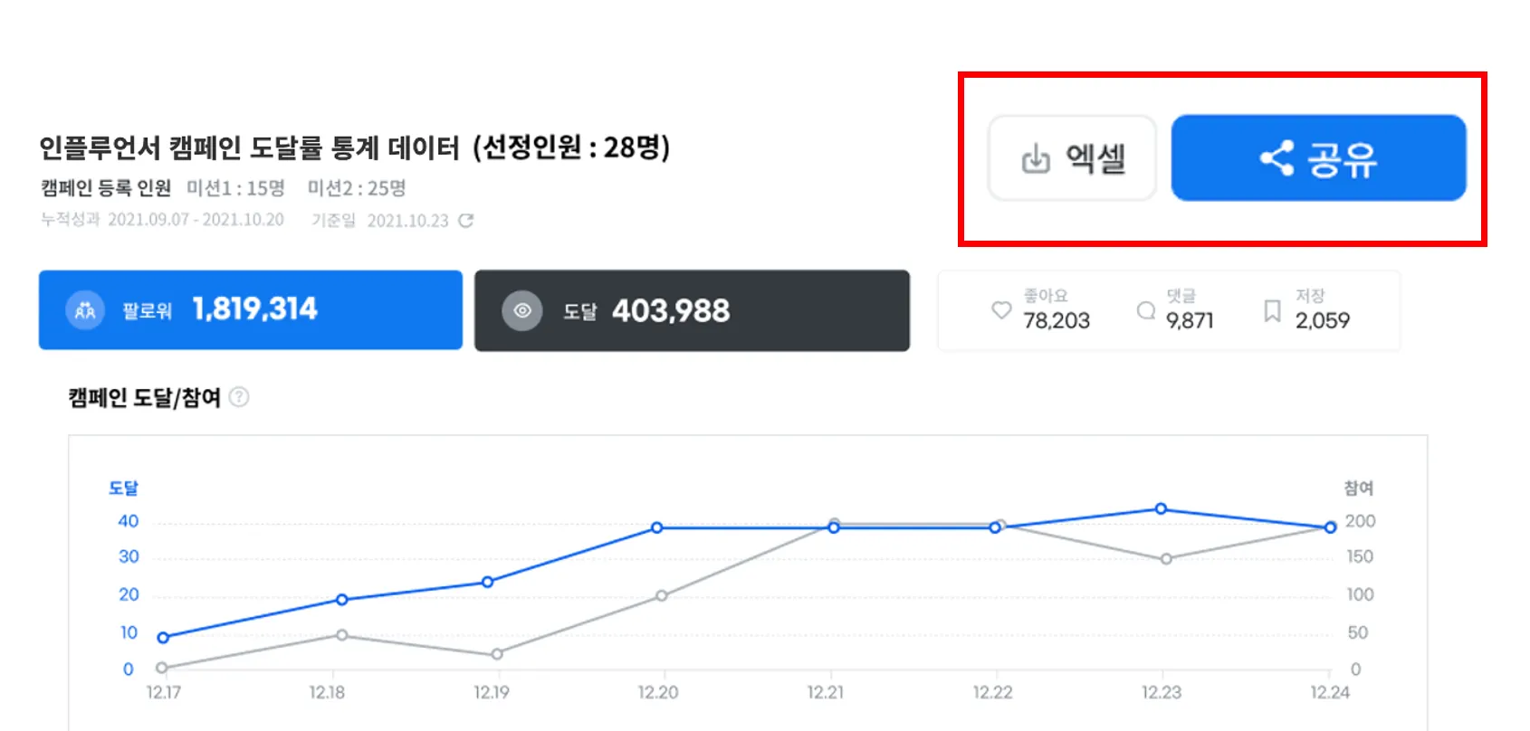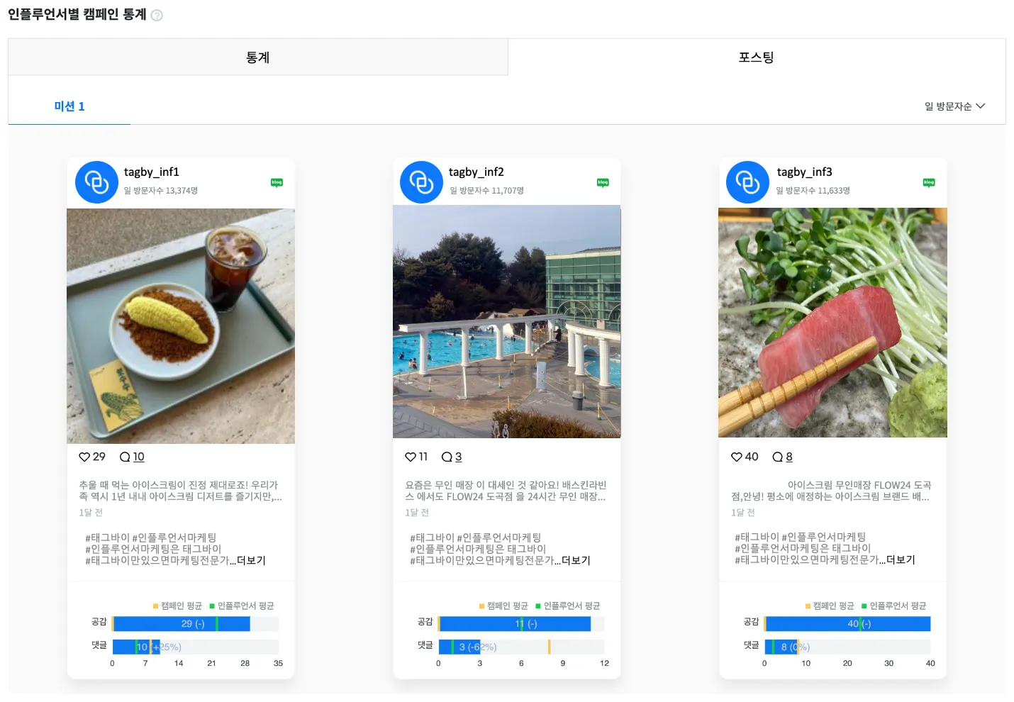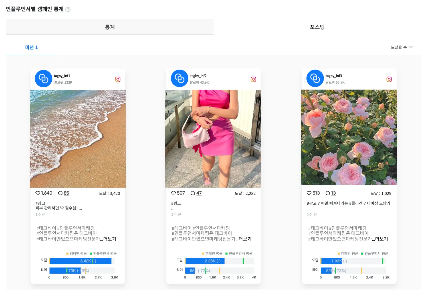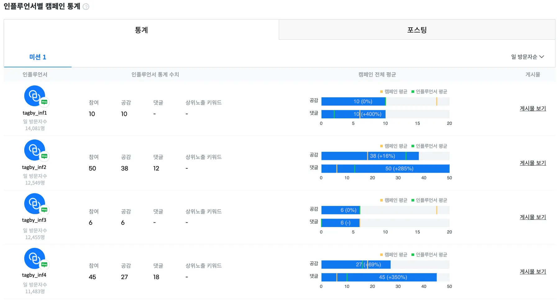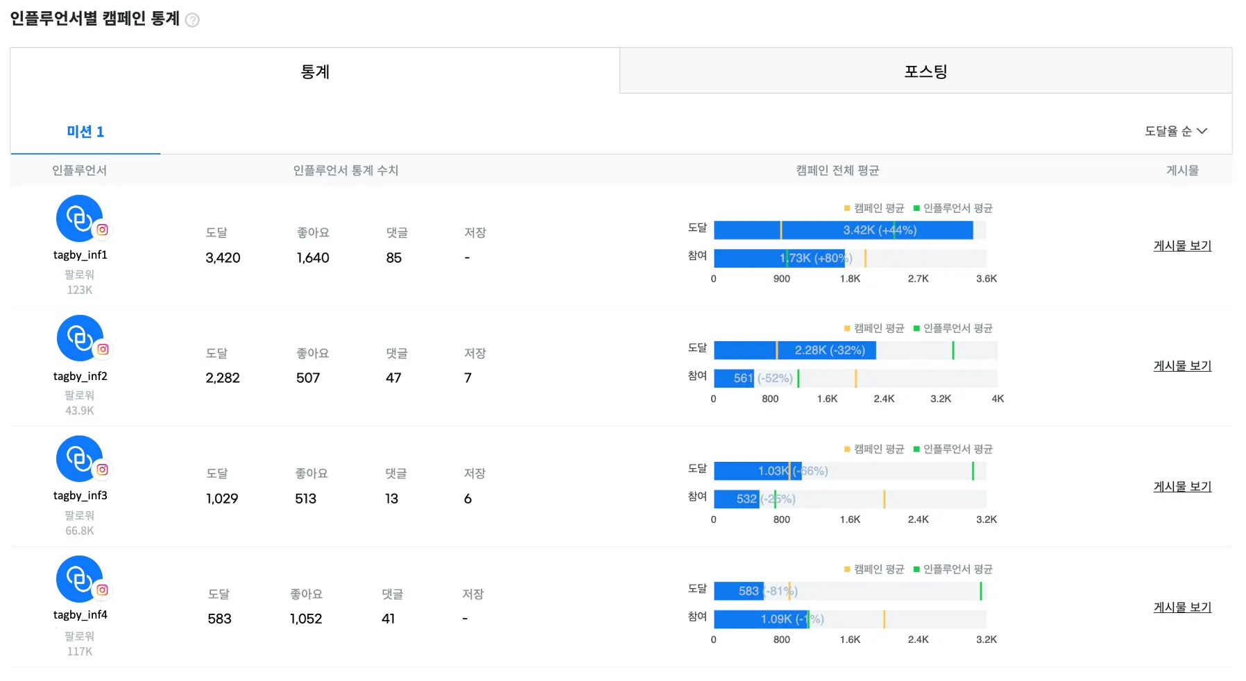 인플루언서 개인, 미션별 통계 데이터를 통해 이번 캠페인의 성과를 상세하게 분석해 볼 수 있어요.