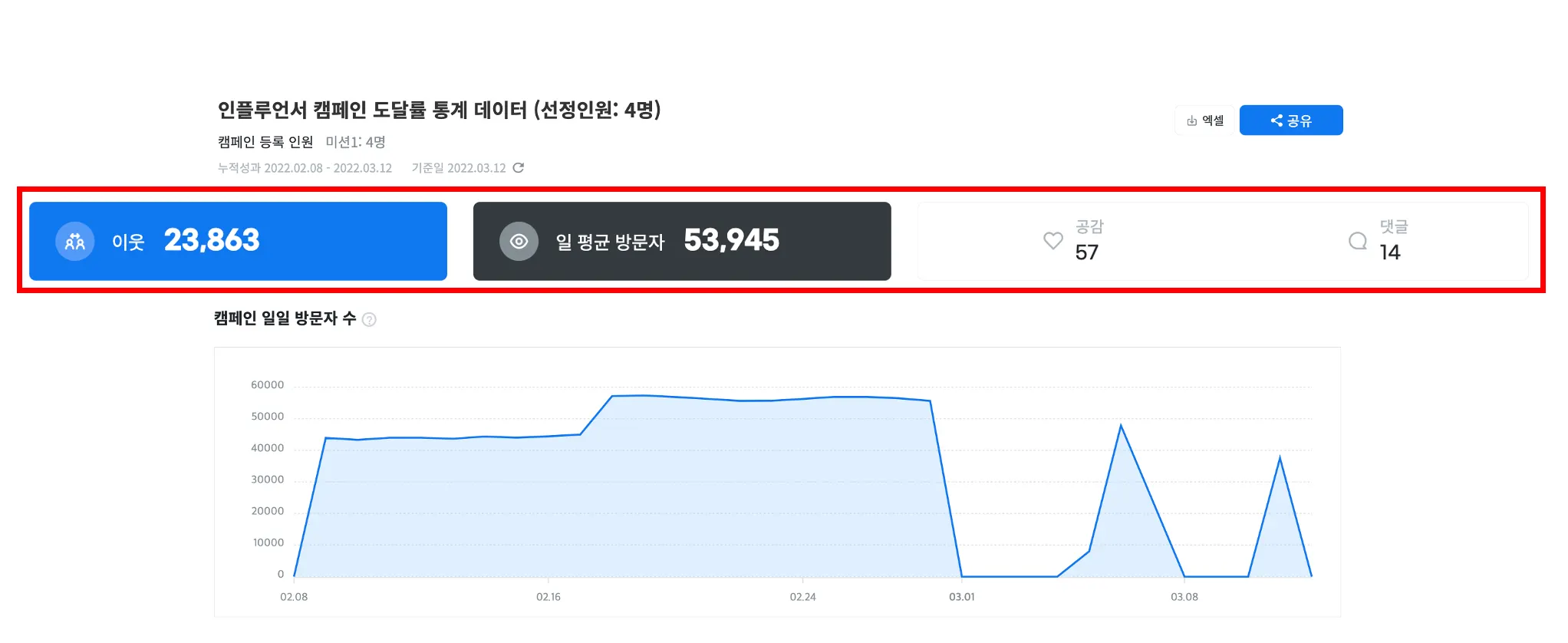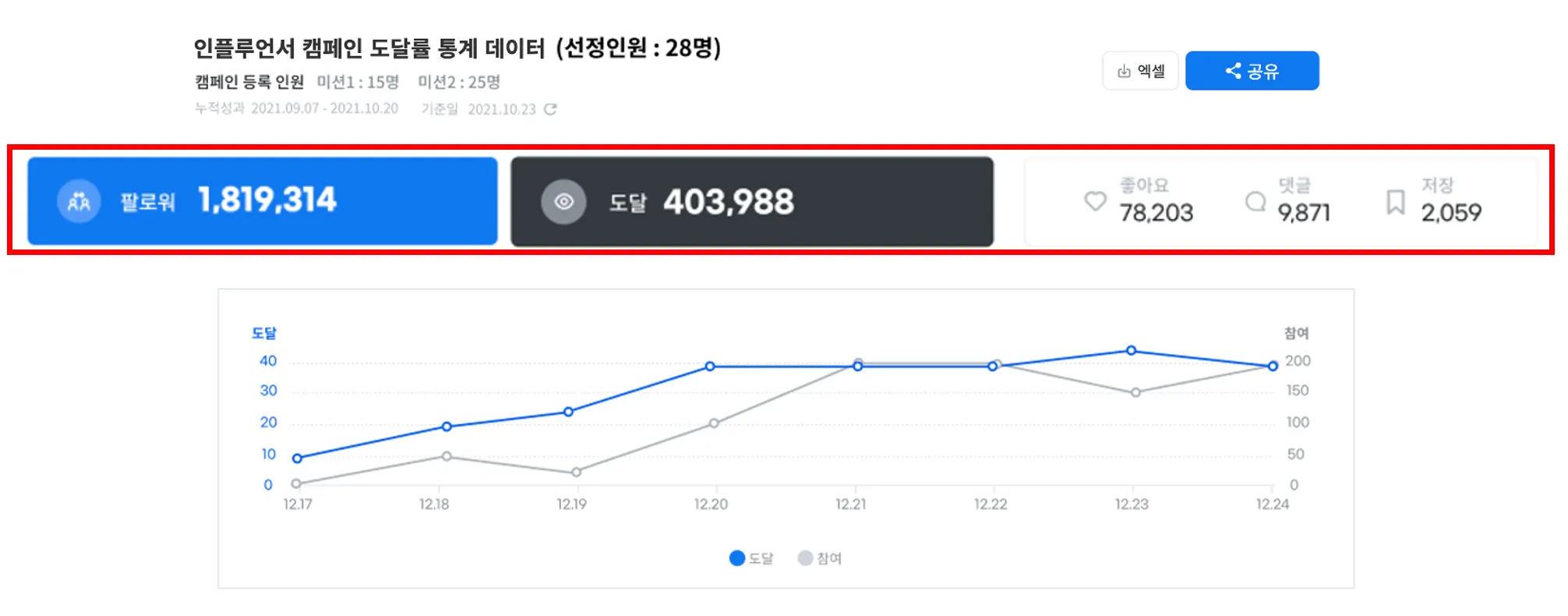 해당 캠페인에 참여한 인플루언서들의 전체 누적 성과를 한 눈에 볼 수 있어요.