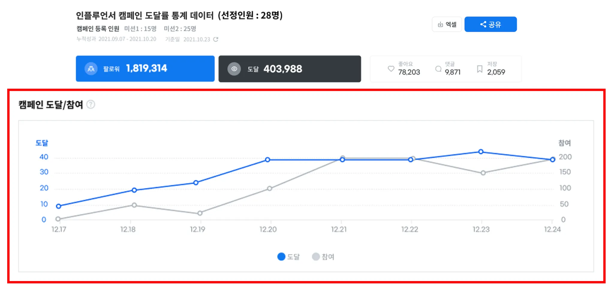 전체 팔로워 대비 누적 도달율, 누적 참여율을 분석하여 캠페인 성과를 측정해 보세요.