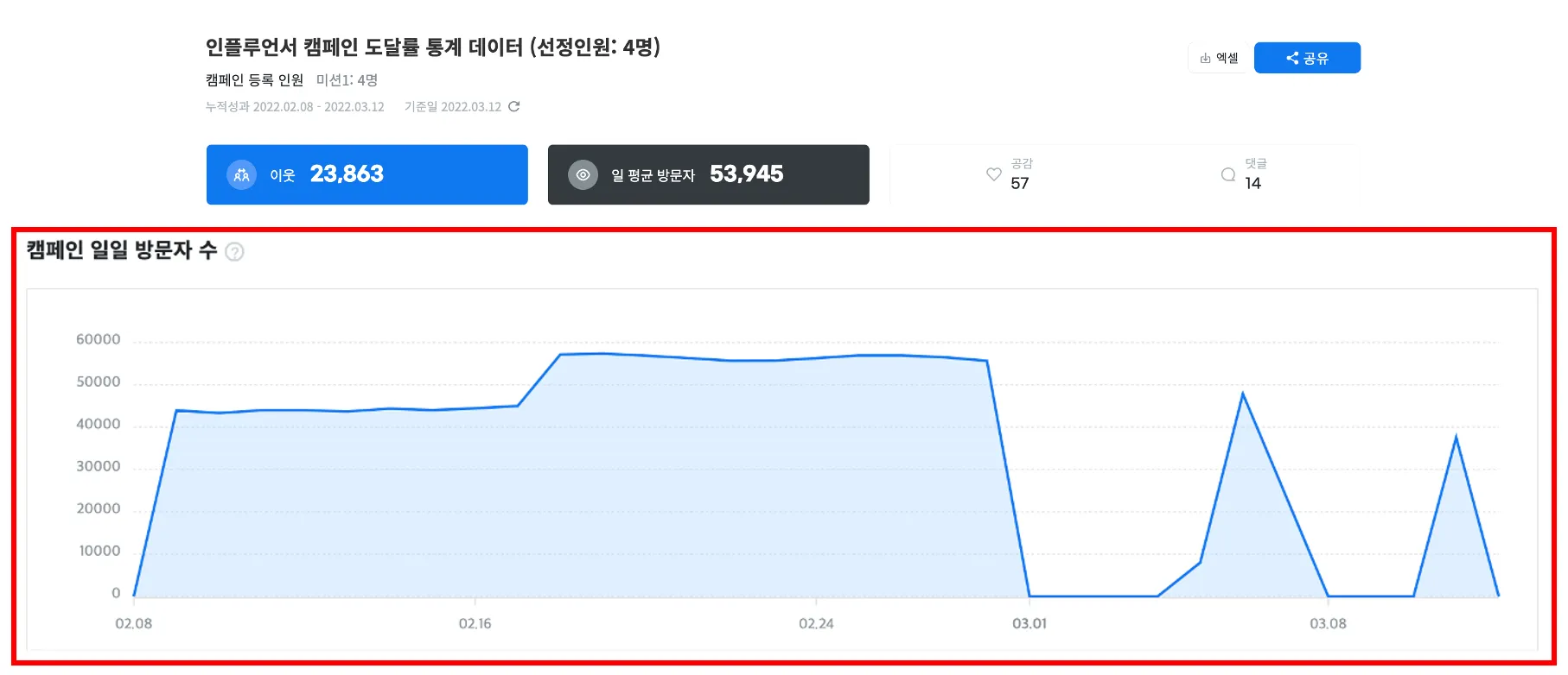 미션 마감일이 가까울수록 포스팅되는 게시물들이 많아서 일 도달/참여 수가 올라가요.