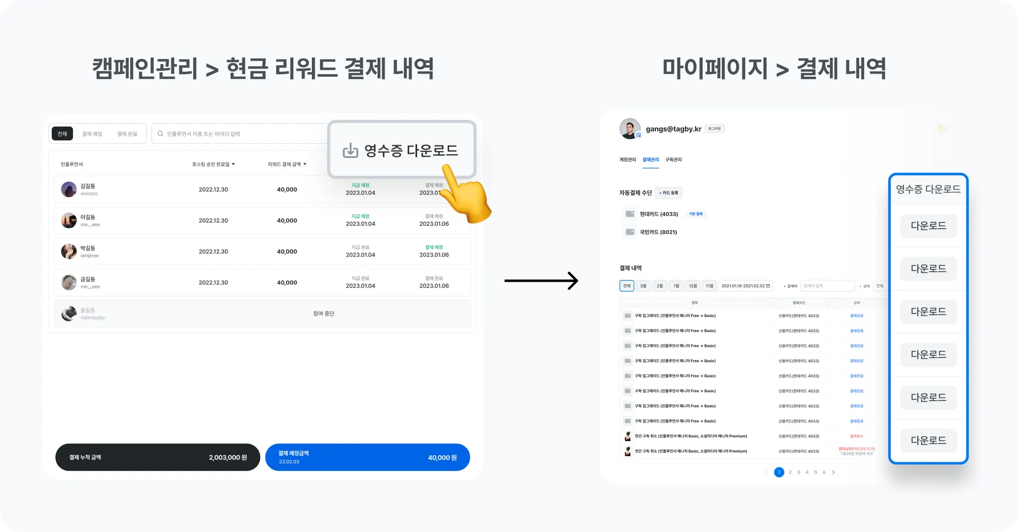 현금리워드 결제 방식이 변경되었습니다. 이전에는 리워드 결제 후 인플루언서 원천세 신고를 직접 진행해야 했다면, 이제는 원천세 신고를 직접 할 필요가 없게 되었어요. 따라서 원천세 신고를 위한 자료를 다운로드하기 위해 쓰였던 ‘정산’ 페이지가 각 캠페인마다 결제된 내역을 볼 수 있는 ‘현금리워드 결제 내역’ 페이지로 변경되었어요.