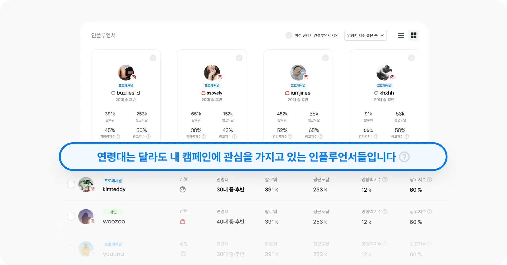 내 캠페인에 관심 있는 인플루언서가 더 있을지 궁금한가요? 내가 설정한 연령대가 아닌 인플루언서가 신청했을 경우, 따로 모아서 보여드려요. 이들의 데이터도 동일하게 제공하고 있으니, 살펴 보고 마음에 든다면 선정하여 진행할 수 있어요.