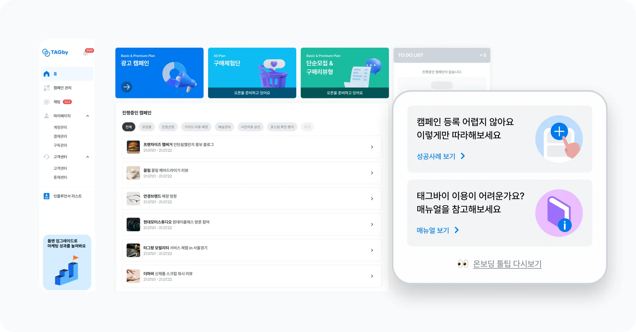 자주 쓰는 기능에 더욱 쉽게 접근할 수 있도록 홈 대시보드를 개선했어요. 상단 카드에서 광고 캠페인을 바로 등록할 수 있고, 서비스 오픈 예정이 임박한 캠페인 상품들을 배치했어요. 오른쪽 하단에는 캠페인 성공 사례와 가이드를 두어 언제든 편하게 열어보고 참고할 수 있어요.