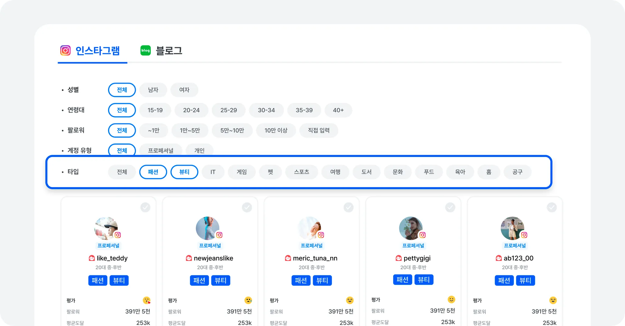 이제 내가 원하는 타입의 인플루언서를 검색하고 선택할 수 있어요. 블로그인 경우 “네이버 인플루언서” 전용 타입으로 필터링할 수 있어요.