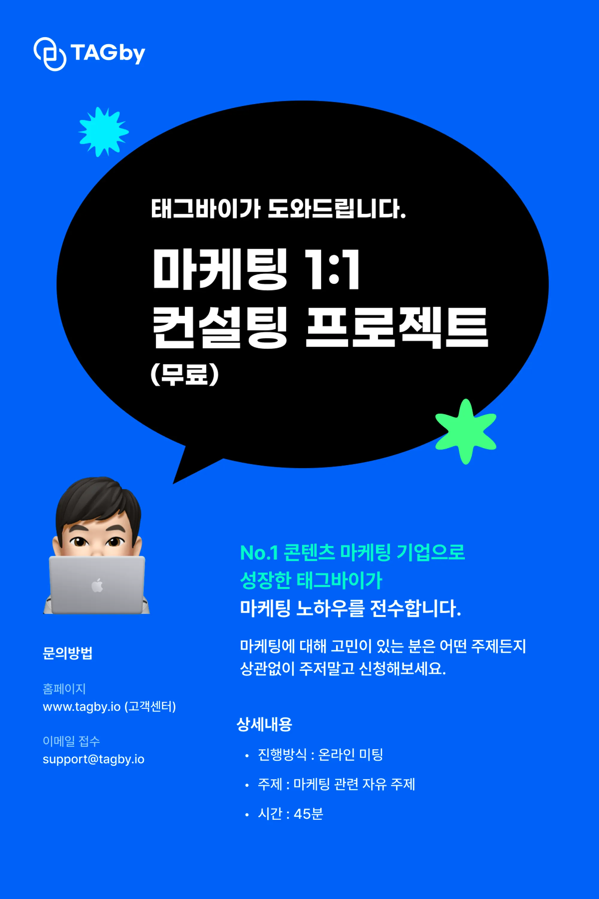 종합 콘텐츠 마케팅 플랫폼 태그바이(TAGby)가 마케팅 노하우를 전수하기 위해 마케팅 1:1 컨설팅을 무료로 진행한다고 24일 밝혔다.