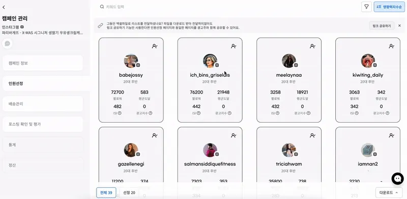 인플루언서 계정 데이터 분석을 통해 보다 높은 효율의 인플루언서와 마케팅을 진행할 수 있어요.